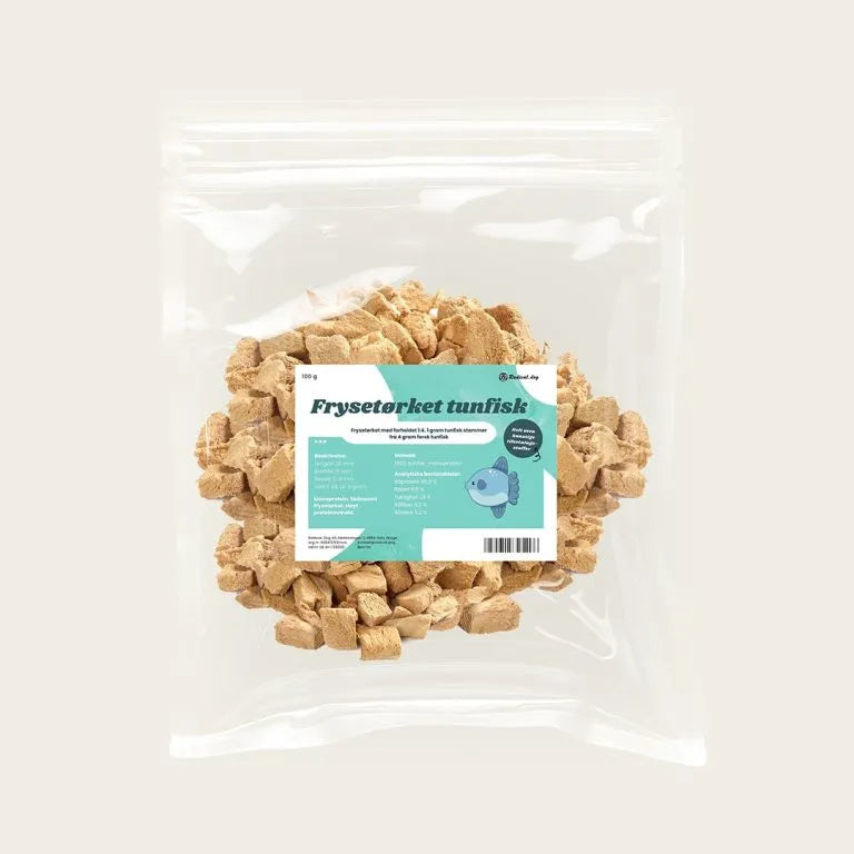 Dette produktet består av 100% tunfisk som har blitt frysetørket for å bevare vitaminer, mineraler, aroma og smak.