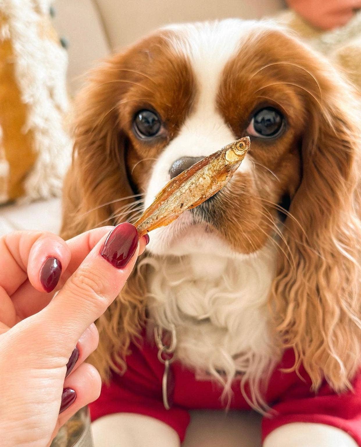 Gi som godbit – 3 til 4 fisk/dag per 10 kg kroppsvekt for hunder og 5 kg kroppsvekt per katt.